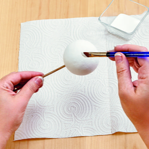 Roll out sections of clay large enough to wrap around the balls. Roll the clay out so it is thin and even. Wrap the clay around the balls. Trim excess clay from ball. Smooth seams where the clay overlaps. Let dry completely