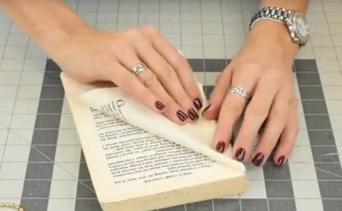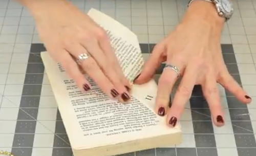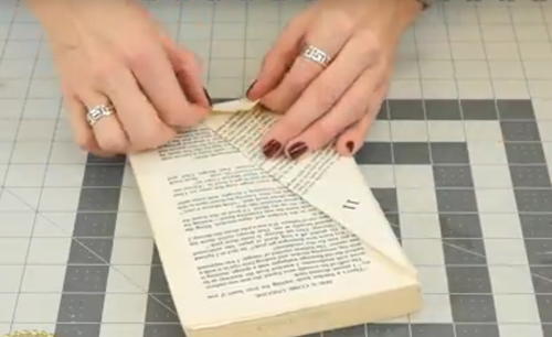 First start by folding each page of the book. Take the top right corner and fold it into the crease of the book, then take that folded angled edge and fold it a second time into the crease of the book. Fold the bottom of the page up.