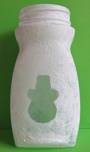- Spray contact glue onto the tape side of the snowman and allow the glue to dry. Then, position the snowman sticker on the glass jar and press down firmly.