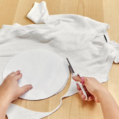 Cut a 14”, 12” and 10” circle out of the cable knit fabric. Lay the knit circles face down. Center the discs, batting side down, onto the knit circles.