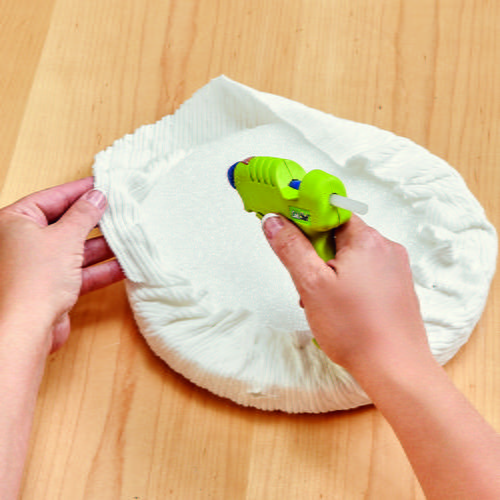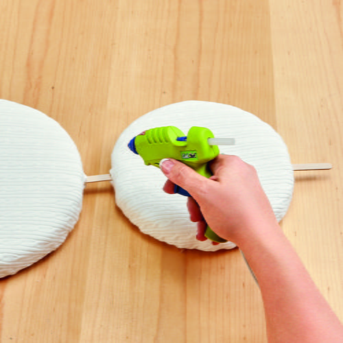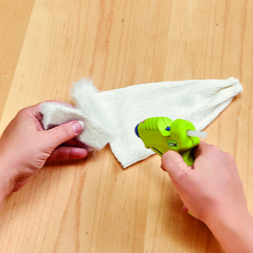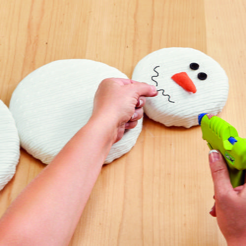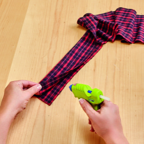 Cut a 45” long x 5” wide piece of flannel for the scarf. Glue the flannel along the 45” edges to form a long tube. Cut slits in the ends of the flannel tube to create fringe. Tie the scarf around the snowman’s neck.
