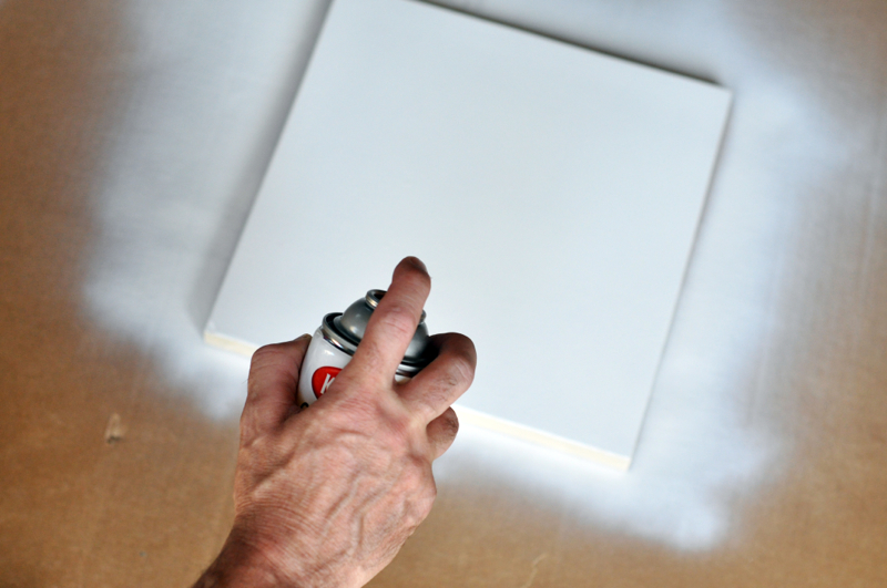 - In a well ventilated area, I used my garage, lay down cardboard or paper and place your board on it. Start with the Krylon Color Master white paint first. Lightly spray back and forth building up layers of color until the desired color has been reached. Because the Color Master paint has a built in primer it covers easily and completely. Don’t forget to spray the sides as well for a finished look to your project. Once you are finished painting, leave your piece to completely dry, I let mine sit overnight as it was humid the day I painted and I wanted to ensure that my surface would be ready for the next step