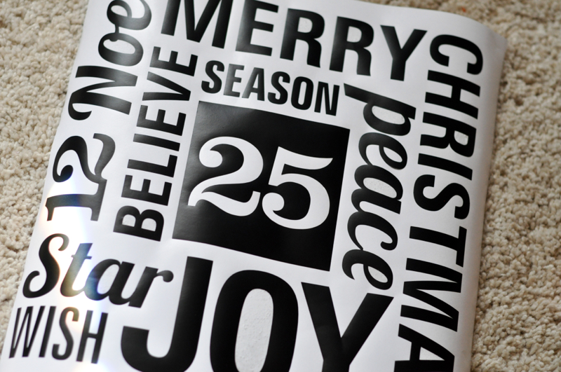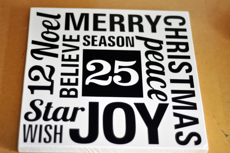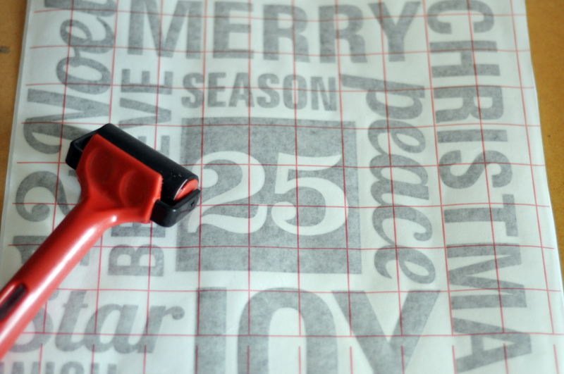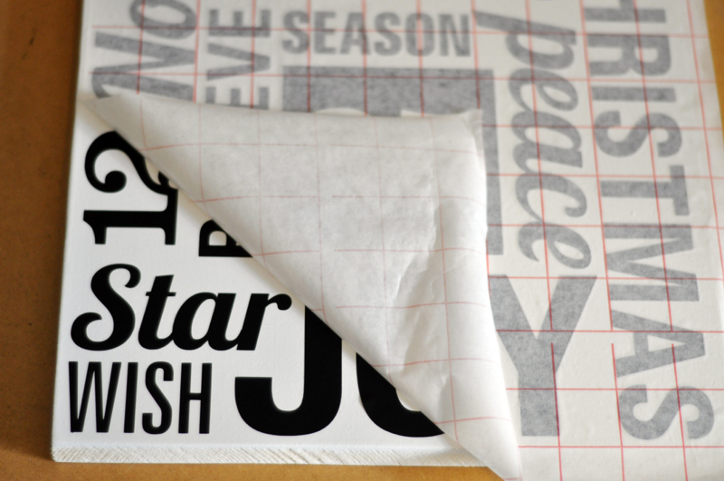 - Using your electronic cutting machine, cut your design onto self adhesive vinyl. If you do not have a Cameo, Cricut etc., you can cut letters by hand from the vinyl of use letter stickers. Once you have cut the design from the vinyl, use backing paper to transfer the design to your painted wood piece. I used a brayer to apply it, you can also use a credit card, popsicle stick or rub firmly with your hands. Pull away the backing paper and discard, you should now have you wood piece with only the vinyl words on it.