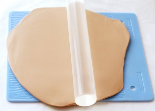 Roll out clay on protected surface with acrylic roller to 1/4 inch or less in thickness.