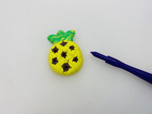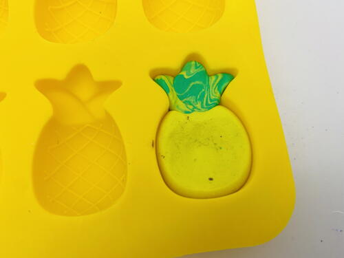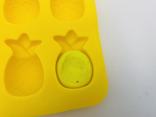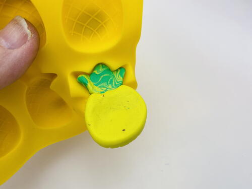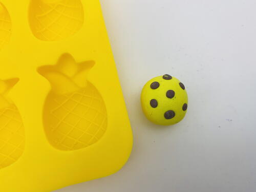 For the pineapple design, make a basic shape that will fill up the fruit area of the mold. I chose a Yellow ball and added brown spots to it. Press the spots to the ball really well.
