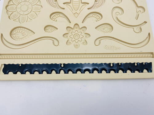 We will make the decorative strips that go around the top edge of the vase first. Stir Black Liquid Sculpey® well before using. Select a silicone mold that has a narrow and thin design. Fill the design with a layer of Black Liquid Sculpey® (LS). Tap the mold several times to release air bubbles. Then fill the mold to level with more Black LS and tap again.