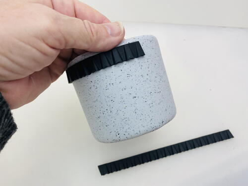 Now it’s time to wrap the top edge of the vase in the Black LS pieces that we made in Step 2. Position the first one about 1/4” away from the top edge. Wrap it as far around as possible. Apply pressure to the molded piece so that it sticks to the Sculpey®. One of the molded pieces was not long enough to go all the way around the vase, so I made two of them.