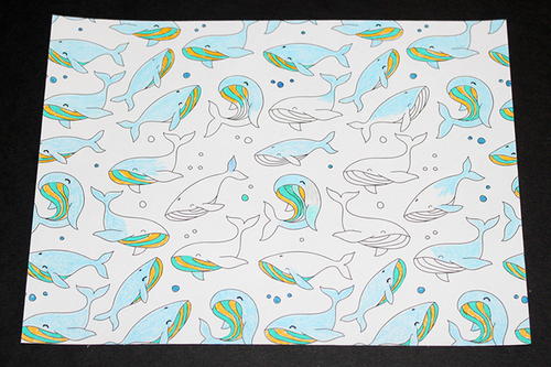 Select the colors of pencils and/or markers then color the images in the area around where the photograph will be placed. I used a blue colored pencil for the large areas and Gelly Roll markers for smaller areas. Practice on an image that will be hidden by the photograph to help you decide which colors to use. Use the black micron pen to go over any small details that have been covered by the colored pencil.