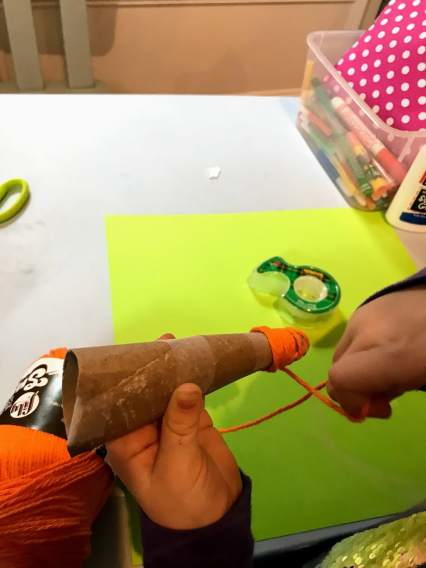From the blogger: "Since playing “restaurant” and “chef” just never gets old in our house, we decided to make some play food carrots to add to our collection. We always seem to have an abundance of empty toilet paper rolls at home, so it made sense to use these to create the body of our play food carrots. Once we formed and secured a cone-shape out of our toilet paper rolls, we simply tightly wrapped our play carrots in orange yarn. As a final step, we taped strands of green construction paper to the top of the carrot to form the carrot’s stem. "