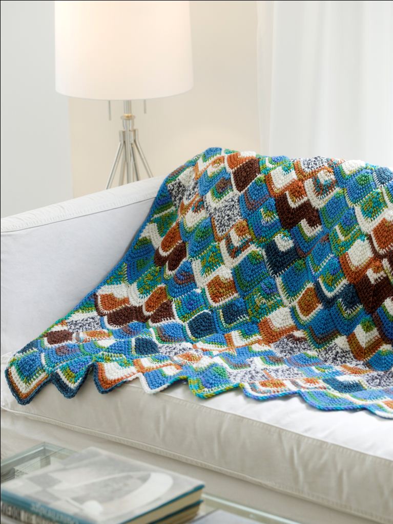 Blues, greens and oranges make this afghan a brightly colored assortment. Use this free crochet afghan pattern from Red Heart Yarn to give your home style. It's a great throw that will keep you nice and warm during the chilly months.
