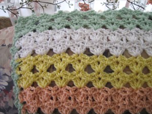- Continue pattern for a total of 83 rows as follows: (4 rows honeydew, 4 rows coral, 4 rows lemon, 4 rows, white) 4 more times, 3 rows honeydew turn after last row and do not fasten off.