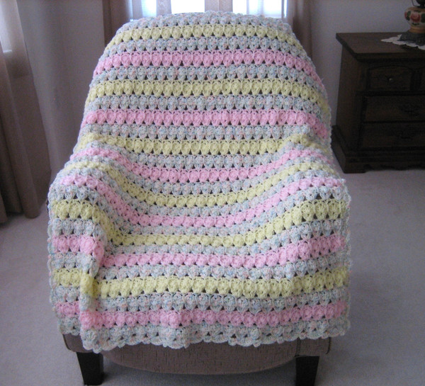 - Row 7: Join baby print in first stitch, ch 3, Shell in next dc and in each dc across, dc in last sc, turn.