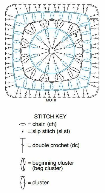 Join Motifs: Hold WS of 2 Motifs tog with sts aligned. Join B with sl st in ch-2 corners of aligned Motifs at top right. Ch 1. Working in back loops only, work 1 sc in each dc through both thicknessess. Fasten off. Join Motifs as shown in diagram: