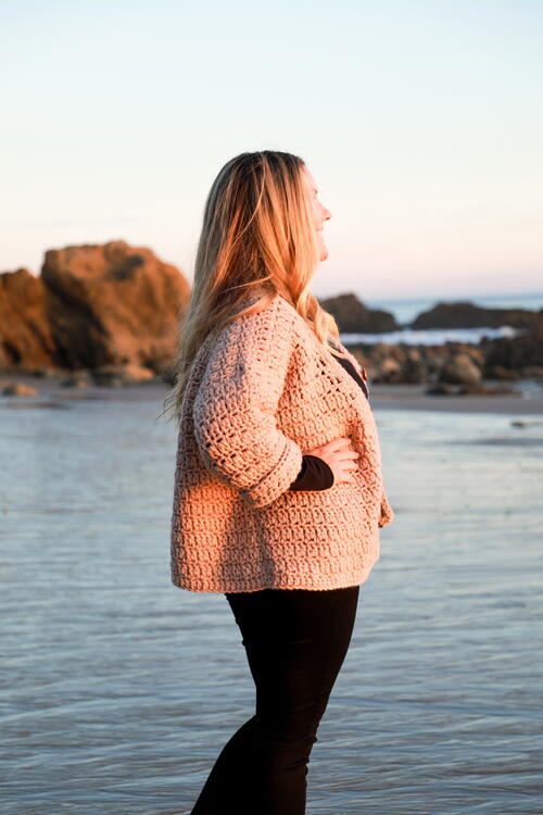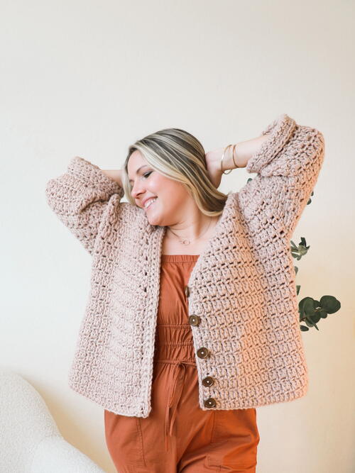 With this cardigan, you’ll be buttoned up and embracing whatever new outing the day holds for you! Worked up in a bulky yarn, this three-quarter cuffed sleeve cardigan is full of texture and fun details. This design uses a simple technique to incorporate buttons so that you can wear it open or closed, and once you see how easy it is to make the button band, you’ll be wanting to add buttons to all your cardigans.
