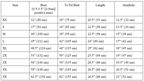 Finished bust: 32 (37, 40, 45, 49.5) (53, 56, 59, 62.5)" / 80 (92, 100, 112, 124) (132, 140, 148, 156) cm, blocked.