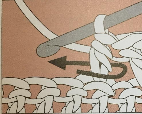 Row 7: Turn your piece so you are once again working facing the outside of the piece. Double Crochet twice over the chain, into the thumb opening. (see image below) Continue the round with one Double Crochet in every stitch in the row before. (26 dc) Chain 3 to build up to your next row.