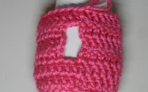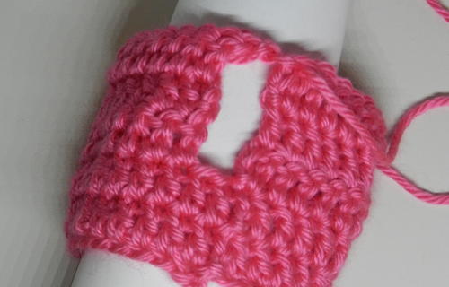 Row 4: Turn your piece so you are working your crochet facing the inside of the piece. Double Crochet once into every stitch, stopping 2 stitches from the end of the round. (24 dc) Chain 3 to build up to your next row. This will be the first row in creating the opening for the thumb.