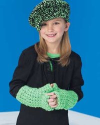 Use this cute easy crochet pattern from Bernat Yarns to make a newboy cap and fingerless gloves for that little girl in your life. This pattern is shown in Bernat softee chunky. She'll look adorable in this matching set.