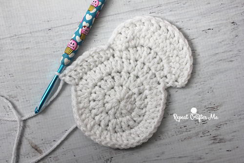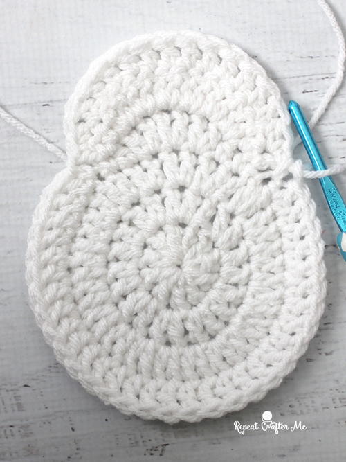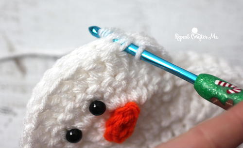 Continue by making a SC in the next stitch along bottom round of snowman, DC in each remaining stitch around the bottom of snowman, SC in last and join to the other side of the “head” of the snowman.