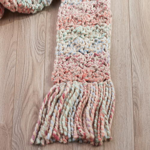 Feel like a doll with this darling chunky yarn crochet scarf pattern. Using jumbo yarn, you'll work up this super scarf in a hurry! It's a great easy crochet pattern. Chunky patterns are fantastic for beginners because they're less likely to be discouraged by the time spent on a project. Bulky patterns work up more quickly than other patterns that use lighter yarn and can take much longer. This scarf is so cozy and will certainly keep you warm worn over a winter jacket or even just around the house. Pair this with an oversized sweatshirt and leggings for ultimate comfort. The fringe is a fantastic finishing detail!