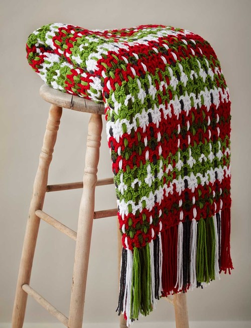 Give your home that warm welcome feel with this Home for the Holidays Afghan. Made to look like a woven blanket, this crocheted afghan is perfect for snuggling up with on Christmas morning. You could also whip up this blanket as a gift for a loved one or use it for an evening spent snuggling with the one you love. By combining crochet and weaving skills, you can create an afghan reminiscent of blankets you may have found at your grandma's house. Perfect for adapting to suit other color combinations as well, this afghan is the perfect way to enjoy the cooler winter months ahead.