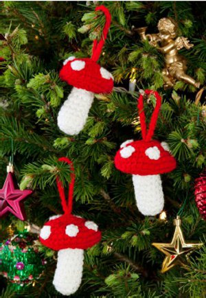 - Polka Dot Mushroom Ornaments, pg. 6: Use leftover red and white yarn to crochet these easy mushroom ornaments. Whether you use them as ornaments on your tree or to decorate your gifts, these whimsical ornaments are quick to crochet. For a more whimsical look, use bright colors.