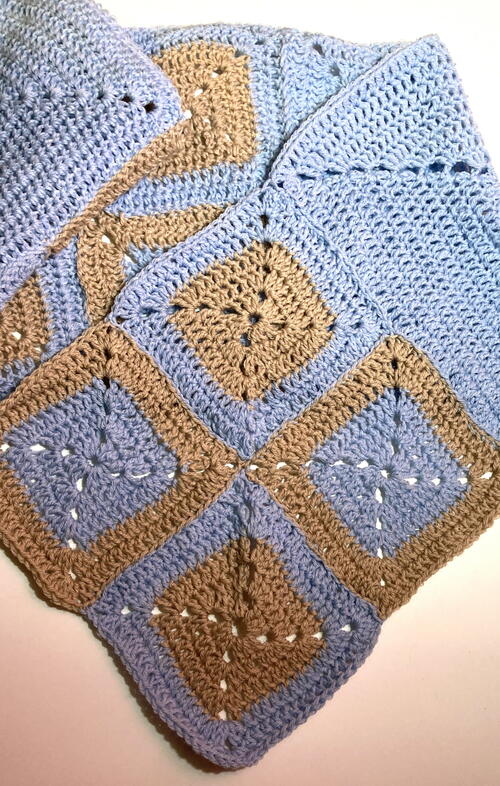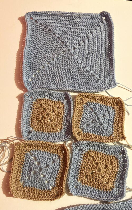 Details on Squares: 2 Larger lighthouse color squares. Using the Lighthouse yarn crochet two squares that are 10 rounds. Finished size 9 X 9-inches. 8 two-toned color squares. 4 with three rounds of crouton in the middle and two rounds of lighthouse color (5 rounds total). 4 with three rounds of lighthouse in the center and two rounds of crouton (5 rounds total). Finished size of each square 4.5 X 4.5-inches. 2 smaller crouton color squares. 2 rounds. Finished size 2 X 2-inches. 1 smaller lighthouse color square. 2 rounds. Finished size 2 X 2-inches. Finishing. Weave in all the yarn ends for each square and cut off the excess yarn.