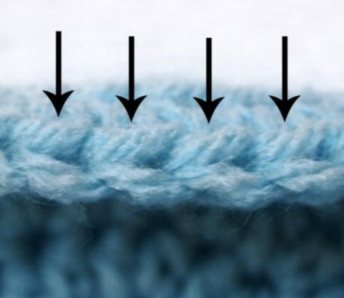 Note on the third loop: Fold your work towards you so the back of the HDC is visible. The arrows in this image indicate the “third loop” on the back of the stitch. You will be working into the back loop and third loop for Round 11 only. -