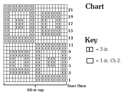1st row: 1 dc in 4th ch from hook. 1 dc in each of next 31 ch. *(Ch 2. Miss next 2 ch. 1 dc in next ch) 11 times**. 1 dc in each of next 33 ch. Rep from * to end of chain, ending at **. 198 sts.