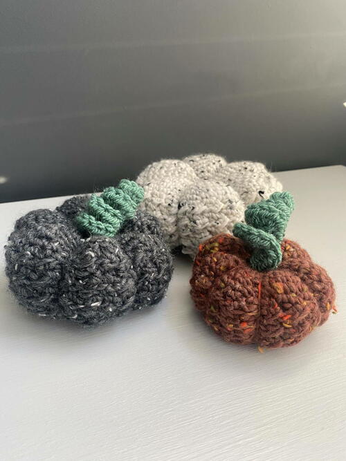 "This set of 3 crochet pumpkin patterns is awash with texture in a gorgeous tweed yarn. These adorable and textured pumpkins are the perfect addition to your fall decor. Crafted with the unique crunch stitch, this pattern creates a delightfully squishy and satisfying texture that's sure to be a hit. The crochet Pumpkin is a relatively quick and easy project, making it ideal for crocheters of all levels. With its charming design and customizable colours, this pumpkin is a versatile piece that can be dressed up or down to match your personal style. There are 3 different sizes of pumpkin to make, which look fabulous displayed together or even in a stack. Size: There are 3 different sizes of pumpkins: Small pumpkin - 3.5" x 2" (9cm x 5cm) Medium pumpkin - 4.75" x 2.5" (12cm x 6cm) Large pumpkin - 6" x 2.75" (15cm x 7cm) "