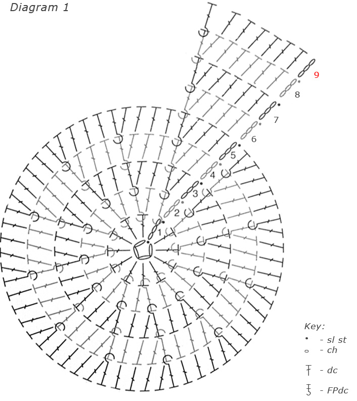 Rnds 5 - 8: ch 3, dc in next 10 dc, FPdc around next FPdc, [dc in next 11 dc, FPdc around next FPdc] around, join with sl st in top of beg ch-3.