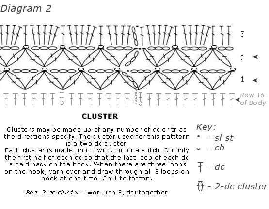 I think I was mis-understanding what the word beg meant. I think now it just means begin with a 2 dc cluster. Does anyone think that is right? I can get the simplest things very complicated. Its just that its hard when you don't know the crochet language very well, yet. Thanks Marcyc...Your info helped me a lot. I haven't tried it yet so am not sure if its correct, but think it is. Maybe someone else will tell us. I'll let you know if I ever get it finished. It is running very large as someone else said. I hope someone knows how to make the pattern smaller. Donna