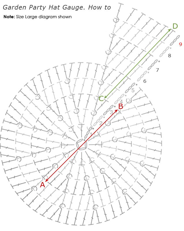 Gauge: First 3 (5, 7) rounds = 4” in diameter (see Diagram3, between points A-B) or 6 (10, 14) rounds = 4” (between points C-D)