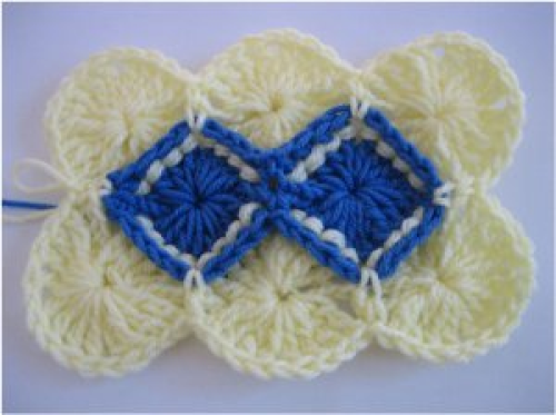 Next Rounds: To make the rectangle larger, continue repeating Rounds 6 and 7 alternatively, working 2 rounds of each color until desired square size. You will be adding 1 sm shell to each side of rectangle with every 2 rounds worked.
