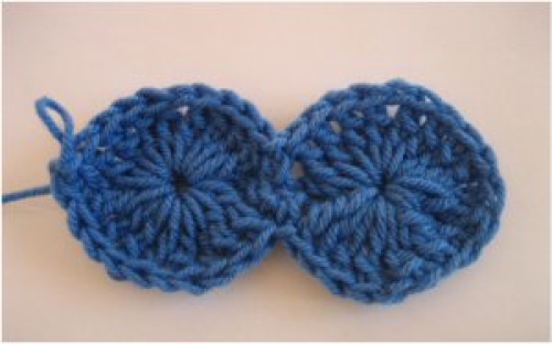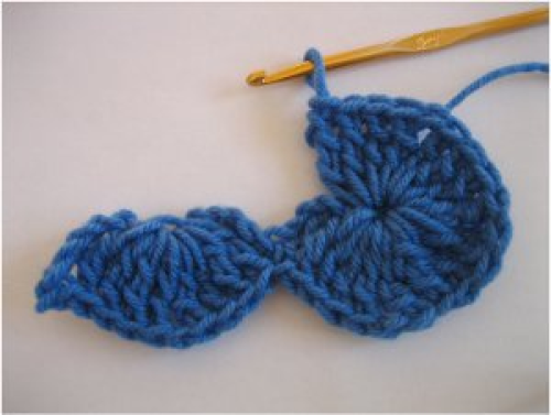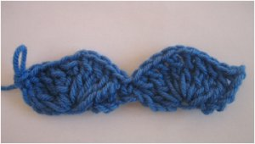 Round 1: With first color ch 22, sc in 2nd ch from hook, [skip 4 chs, sm shell in next ch, skip next 4 chs, sc in next ch] twice. (see photo 1), working in opposite side of starting ch, skip 5 chs, sm shell in next ch, which will be the same ch as sm shell on the opposite side of the ch (see photo 2), skip next 4 chs, sc in next ch, skip next 4 chs, sm shell in next ch which will be the same ch as sm shell on the opposite side, skip last 5 chs, join to beginning sc (see photo 3) and fasten off. (4 sc, 4 small shells)