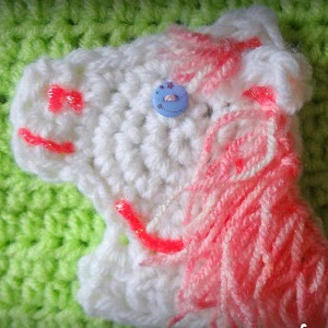 - Add pink sparkly puffy fabric paint in the ears, for the nostril, mouth and jaw line (pushing the mane out of the way). Allow to dry. Sew in a small button eye.