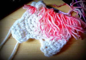 - Cut approx 25 pieces of Pink(Baby Bernat Light 3) at approx. 4 inches ea. Attach to the horses mane using larks knot using 2 pieces at a time, placing in ea ss along mane, and a few between the ears(bangs), trim to desired length.