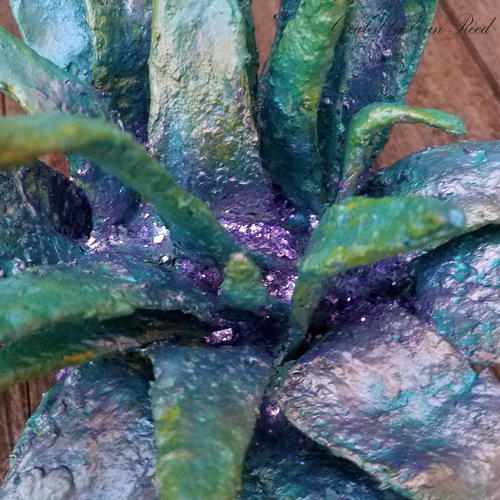 From the Designer: "Art is so much to to make, and sometimes it can can so many different forms. Today it is a sculpture to look like an aloe plant, but a glitter and shiny one = perfect for indoors and one that you do not have to water! I build the base of the aloe plant with rigid wrap, mesh, and a paper mache. Once that all set, I added various layers of Plaid Colorshift paint and Glitterific paints to give the aloe cool effect."