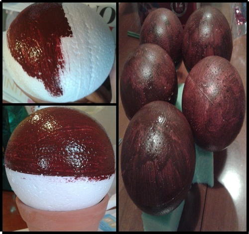 Start by painting the Styrofoam balls brown and this is where the toothpicks would come in handy cause you can either wait for one half to dry and then do the other half. Or once you paint one half you can poke the painted side with a toothpick in order to be able to pain the other half without making a mess, and then let it dry like in the picture