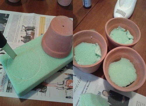 While the balls are drying you can start preparing the flowerpots, grab your foam block and press a flowerpot against it in order to mark the diameter of the pot, then with your knife start cutting, you want to achieve a tight fit in the pot, and also you want to fill it almost to the top (i forgot to take a picture of that, and it doesn´t matter if you use multiple pieces of foam, just make sure that it is really tight)