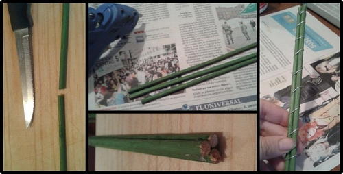 Now the sticks, I used 3 per tree, also mine were really long sticks and i didn't want my trees to be too tall, so i cut them 23cm (11.5 in) long (it doesn't matter if the tips look kind of messy cause no one will ever see that again), then with the hot glue gun i put a dab of hot glue at the top and bottom of the sticks and piled them up as to make a triangle. When they were nice and firm i wrapped my decorative thread around them securing it wit a dab of hot glue.