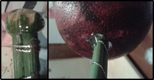 Now the pen comes in handy, where you poked the ball with the tooth pick you can poke a hole with the pen in order to put the sticks in the ball, once you have the hole you need to dab a lot of hot glue on the sticks (like in the picture) and you want to stick it in the ball and push it in for like 2 cm (half an inch)