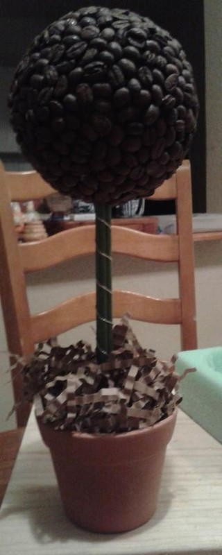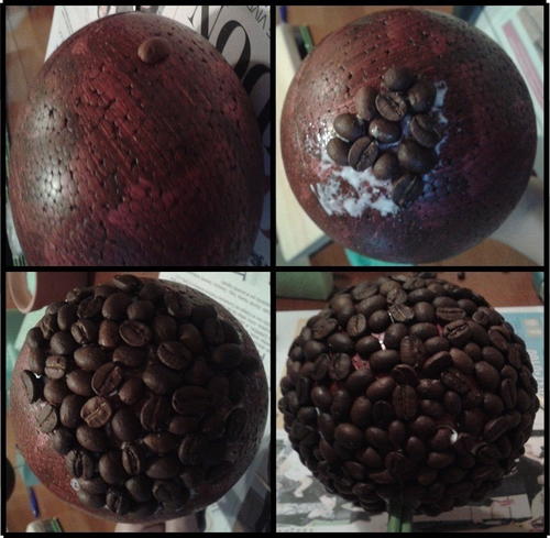 Now the tricky part.... start gluing the coffee beans onto the balls, start from the top of the ball and work your way around and down, paste the beans flat side up and flat side down, alternating frequently, try not to leave too many empty spaces. I used white glue because it doesn't dull the smell of the coffee. This step can be really frustrating, but with some work and practice it'll be really easy. Once the beans are in place, and dry you can randomly glue the beads if you want to.
