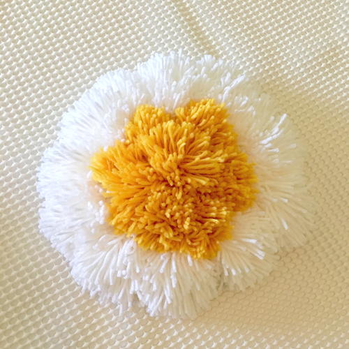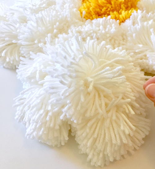 Now you can create the daisy’s petals with the white yarn. I made 5 petals total, and each one has 9 pom poms (so 45 poms in total for the petals). Each petal is made with two rows of white poms, so attach 10 white poms around the yellow center. You may want to lay them out before attaching them securely to check the spacing.