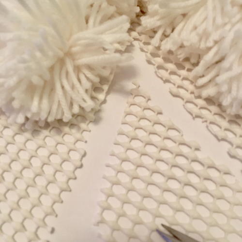Trim off any excess mat material that is still visible from the front side, as well as shortening the tied strings on back. This is your last chance to make big changes or secure your poms before we add the backing piece.