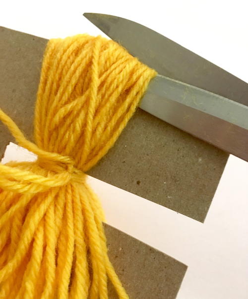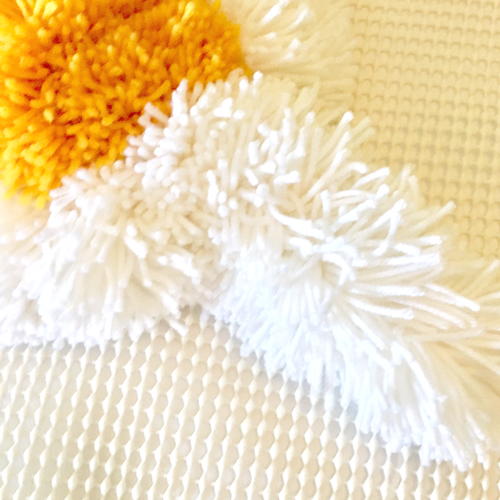 Next, cut 7 yellow and 45 white pieces of yarn to use to use to tie the centers of your poms. They should be approximately 17-18” long. These strings will also serve as the ties to attach the poms to the rug backing, so be sure not to clip them off when making your poms! Keep the strings in your work area as you’ll need them soon.