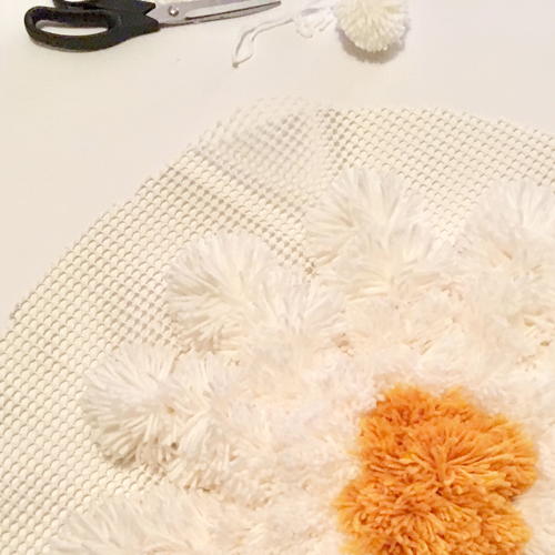 You’ll next need to cut the mat material into a large circle shape. For this tutorial I made the circle about 26-27” across, and will trim the excess after the poms are attached. You can make the daisy on a square piece of mat material, I just find it much easier to imagine the flower shape on a circle.