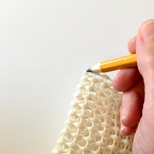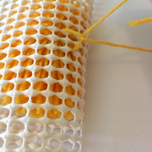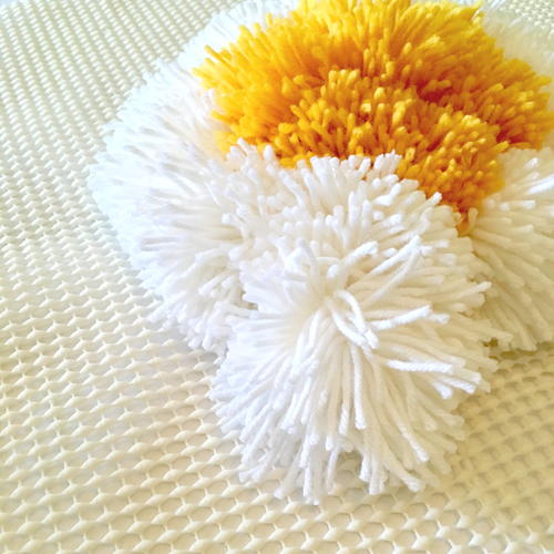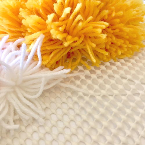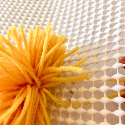 Starting with the yellow poms, make the center of your flower. Attach 1 pom in the very center at the pencil mark: hold the top portion, then guide the pom’s long strings through the holes on the mat and pull it through the back. The strings should skip at least 2 or 3 squares in between poms and the strings. Flip one side of the mat over and tie the poms (gently but securely) together in a double knot.