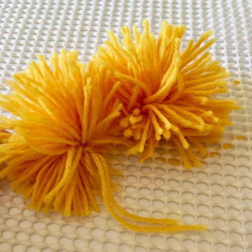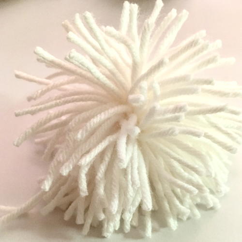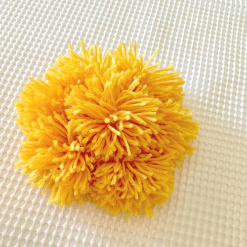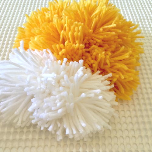 Repeat this process to make a total of 7 yellow and 45 white pom poms. Put them aside in a clean place as you go- I used a large kitchen mixing bowl!