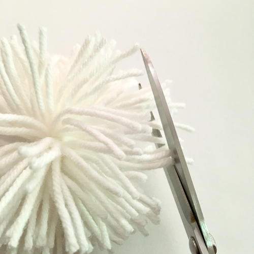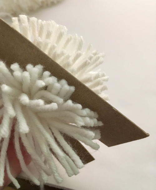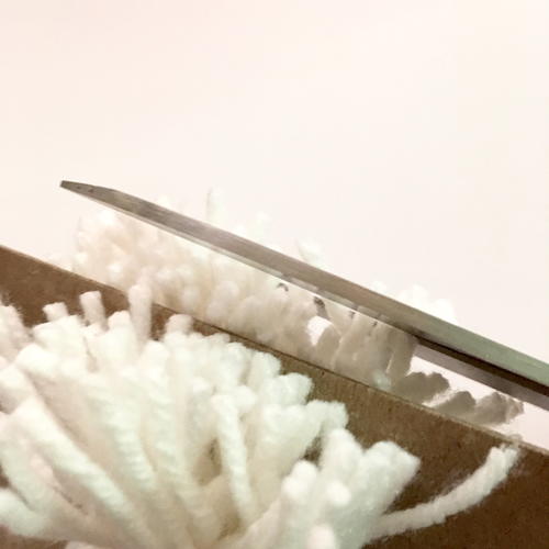 It’s finally time to cut the pom pom off of the maker! Slowly clip the ends along the edge of the cardboard, making sure you’ve clipped all of the loops. Working one side at a time, cut the end and then round off the outer strands so the pom is more even. The wrapping process leaves the outer pieces of string a little longer, so taking a little bit off will improve the shape (see photos). Then repeat this on the other end of the cardboard pom maker.